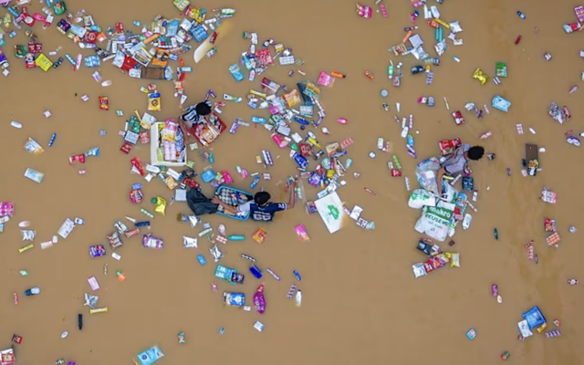 Bức ảnh chụp từ trên không vào ngày 26 tháng 11 năm 2025 cho thấy mọi người lội qua vùng nước lũ ở Hat Yai, tỉnh Songkhla, miền nam Thái Lan, xung quanh là các sản phẩm nổi lềnh bềnh từ một siêu thị. (Ảnh: AFP)