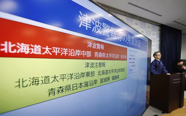 Màn hình hiển thị cảnh báo sóng thần trong một cuộc họp báo tại Cơ quan Khí tượng Nhật Bản ở Tokyo, ngày 20/4/2026 (Ảnh: Kyodo/AP)