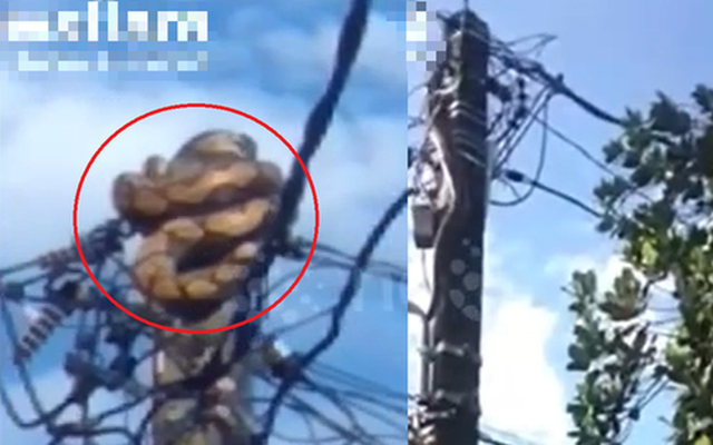 Đoạn clip ngắn chia sẻ trên Newsflare cho thấy con trăn to quấn quanh đỉnh cột điện khiến nhiều người sợ hãi. Đội cứu hộ bắc thang lên và cho con trăn vào bao tải rồi thả về rừng tự nhiên.