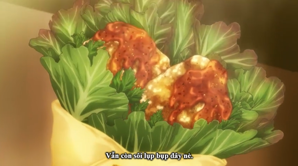 Trong anime này, bánh xèo Việt Nam cũng chính là món đã truyền cảm hứng cho nhân vật chính để sáng tạo ra 1 món bánh mới. Thay vì cho thịt, tôm và giá đỗ như bánh xèo Việt Nam, nhân vật chính đã dùng gà karaage kiểu Nhật cho vào giữa phần vỏ bánh khiến ai ăn cũng đều mê mẩn.