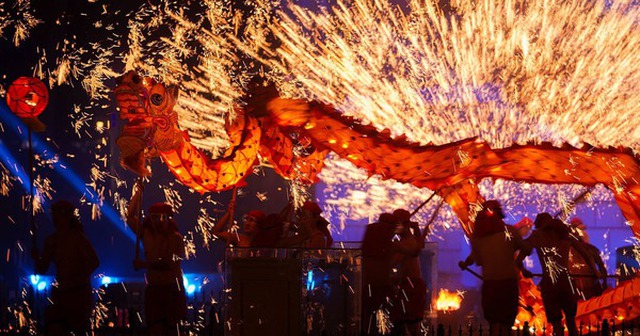 Màn biểu diễn pháo hoa "rồng lửa thép hoa" trước thềm Tết Nguyên đán tại một công viên giải trí ở ngoại ô Bắc Kinh - Trung Quốc, ngày 14-2. Ảnh: AP