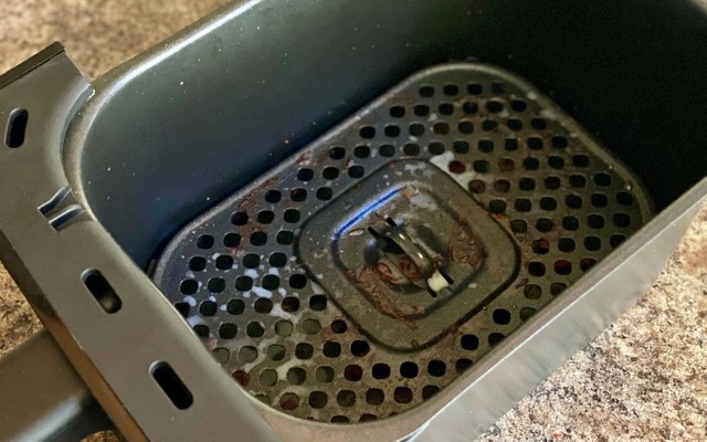 Nồi chiên không dầu của nữ phóng viên Angela chứa đầy cặn bẩn thức ăn và dầu mỡ. (Ảnh: Angela Patrone)