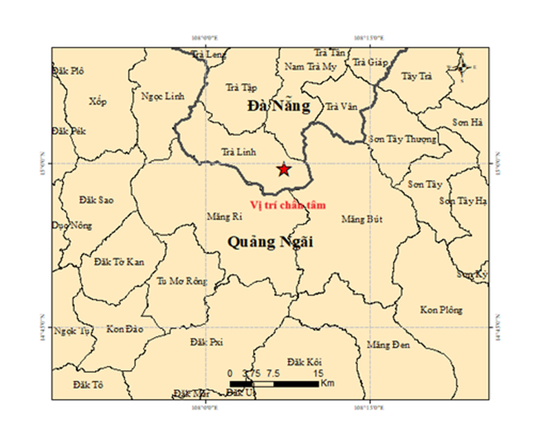 Đến 8 giờ 09 phút, một trận động đất có độ lớn M = 2.6 xảy ra tại vị trí có tọa độ 14.981° vĩ Bắc – 108.114° kinh Đông, độ sâu chấn tiêu khoảng 8.1km; xảy ra tại khu vực xã Trà Linh, thành phố Đà Nẵng.