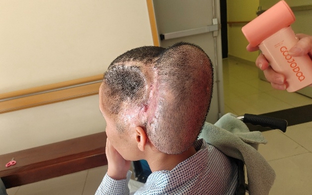 Đến tháng 1/2026, bệnh nhân được thực hiện phẫu thuật: Vá màng sọ bằng lưới titan, cắt bỏ sẹo giãn diện rộng 90 cm², lấy túi giãn và chuyển vạt da đầu có tóc che phủ toàn bộ vùng khuyết.