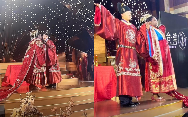 Sau phần đón dâu, đôi uyên ương thay trang phục truyền thống Trung Quốc với áo cưới long phụng, vô cùng lộng lẫy. Trong lễ cưới, họ có những cử chỉ tình cảm, trao nhau nụ hôn trên má, chứng tỏ tình cảm sâu đậm dành cho nhau. Tuy nhiên, phản ứng của bố mẹ chú rể lại khiến nhiều người chú ý.