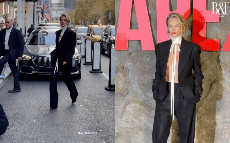 Xuất hiện tại buổi công chiếu phim “Apex” ở New York, Charlize Theron chọn một set suit đen thuộc BST Menswear Thu/Đông 2026 của Dior. Nhưng cú twist khiến cả cõi mạng phải bàn tán lại nằm ở cách cô mặc nó: blazer mở toang, bên trong hoàn toàn là “ngực trần”. Charlize cũng kết hợp cùng quần âu cạp cao và một chiếc cổ áo xếp ly trắng mang vibe cổ điển thời Victorian.
