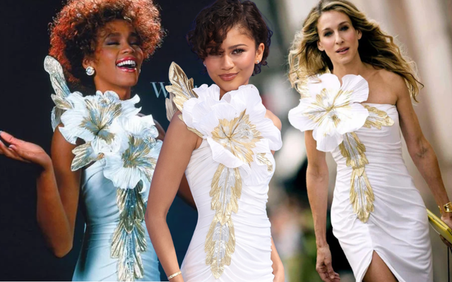 Màn đụng hàng có tính toán của Zendaya (giữa) với cố danh ca Whitney Houston (trái) và Carrie Bradshaw (phải).