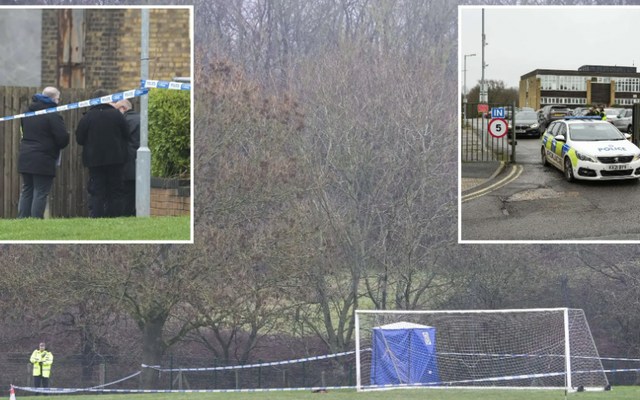 Cảnh sát tại hiện trường nơi thi thể một người đàn ông được tìm thấy trên sân bóng đá (Ảnh: Alamy)