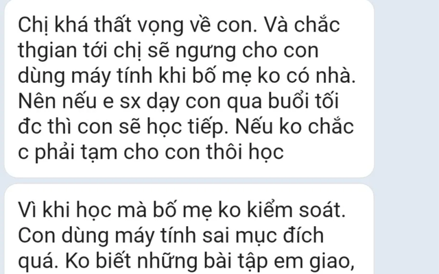 Người mẹ cho biết mình khá thất vọng khi phát hiện con ỷ lại vào AI. Chị dự định trong thời gian tới sẽ ngưng cho con dùng máy tính khi không có bố mẹ ở nhà. Theo đó, nếu cô giáo có thể sắp xếp dạy vào buổi tối thì con vẫn sẽ tiếp tục học; còn nếu không, gia đình có thể sẽ phải cho con tạm dừng.