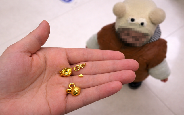 Không kịp suy nghĩ nhiều, người mẹ lập tức móc số vàng còn trong miệng con ra ngoài. Tuy nhiên, ba chiếc chuông nhỏ gắn trên khóa vàng đã bị cắn vỡ và chị nghi ngờ một phần mảnh vàng đã bị bé nuốt vào bụng. Sáng hôm sau, thấy con bú kém, ăn không ngon miệng, chị càng thêm lo lắng và vội vàng đưa con đến bệnh viện kiểm tra.