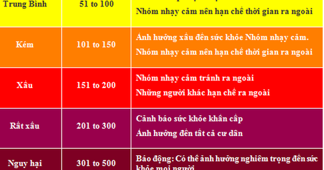 Với chỉ số chất lượng không khí ở mức rất xấu (AQI 201–300), Bộ Y tế cũng khuyến cáo người bình thường tránh các hoạt động ngoài trời kéo dài hoặc vận động gắng sức, ưu tiên các hoạt động trong nhà, hạn chế ra các khu vực ô nhiễm cao và nếu cần, nên sử dụng khẩu trang ngăn bụi mịn.
