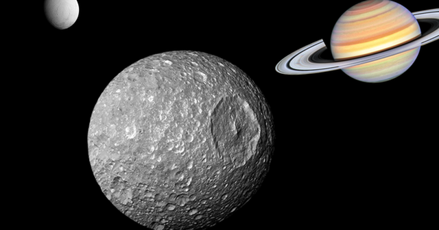 Mặt trăng Mimas của Sao Thổ có thể sở hữu đại dương ngầm và thậm chí là sinh vật ngoài Trái Đất, dù nước bề mặt đại dương này đang sôi - Ảnh đồ họa: NASA