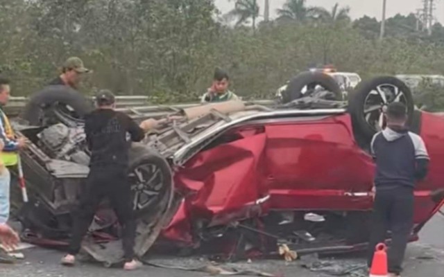 Ô tô con lật úp, biến dạng sau va chạm với xe đầu kéo trên cao tốc