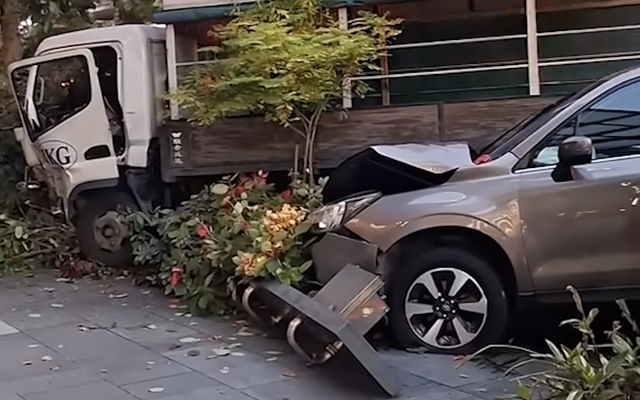 Chiếc xe tải và một chiếc ô tô đã lao ra khỏi vỉa hè, cả hai xe đều bị móp cản trước và một chiếc ghế đá bị đổ.