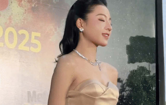 Cùng với nhan sắc này, mái tóc đen được tạo kiểu uốn sóng mềm, buông gọn về phía sau, vừa cổ điển vừa hiện đại, tôn lên phần cổ cao và bờ vai thanh mảnh. Bộ váy dáng ôm màu nude ánh champagne, đính kết tinh xảo ở phần thân dưới, giúp tôn trọn vóc dáng và tạo cảm giác lộng lẫy nhưng vẫn rất tinh tế.
