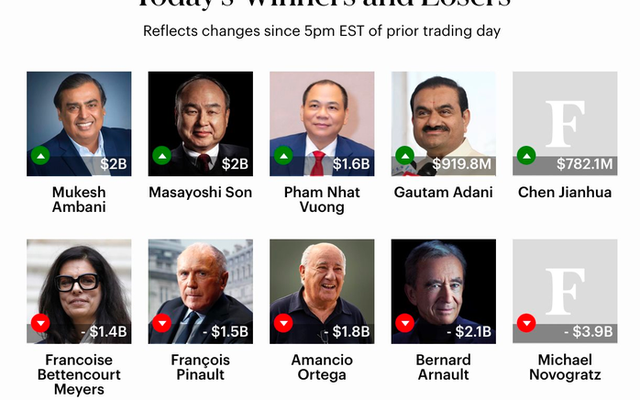 Trước đó một ngày, Forbes cũng xếp ông Phạm Nhật Vượng vào nhóm 5 tỉ phú có mức tăng tài sản mạnh nhất thế giới trong ngày 15-4, cùng với các tên tuổi của châu Á như Mukesh Ambani, Masayoshi Son và Gautam Adani.