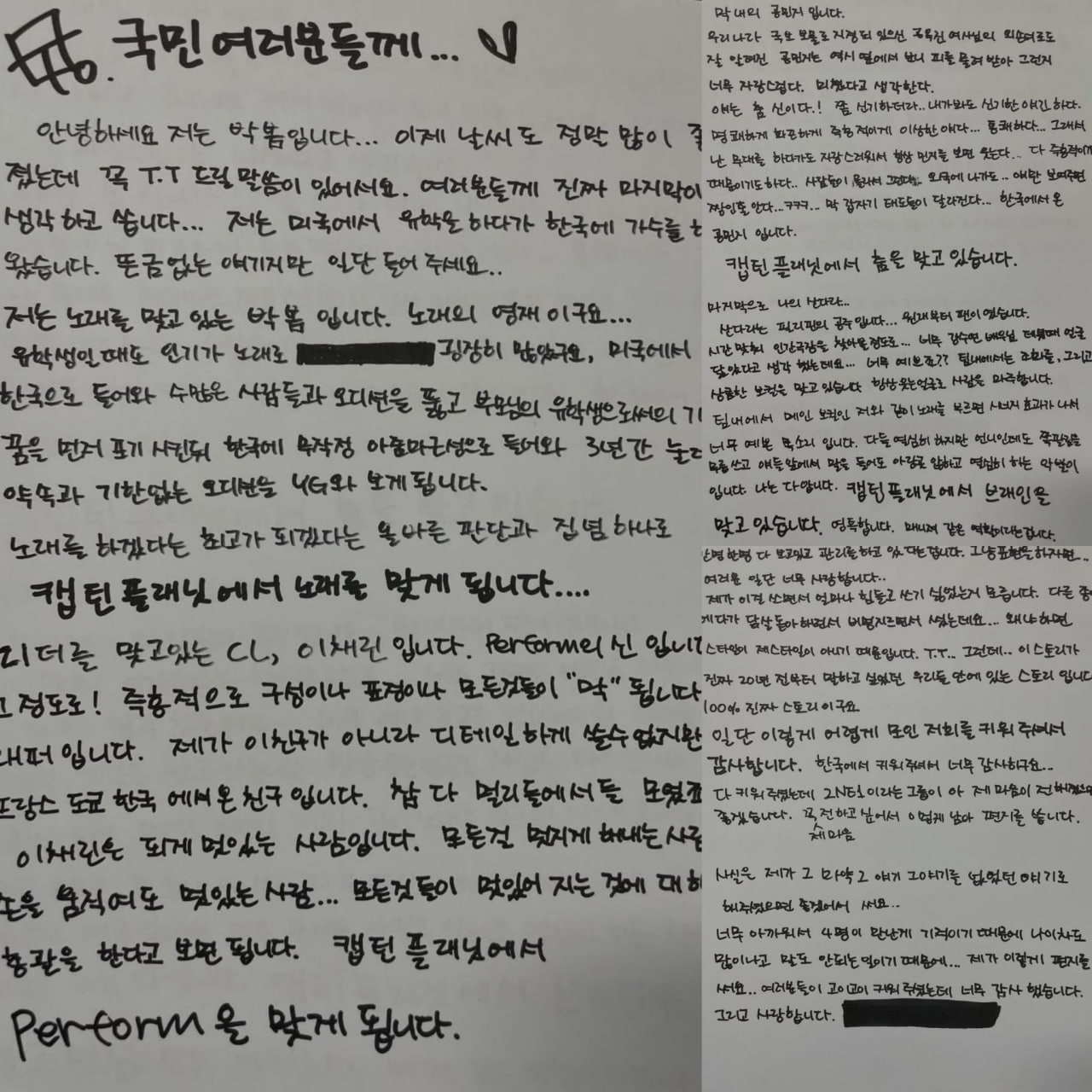 " Kính gửi toàn thể công chúng... Xin chào, tôi là Park Bom... Thời tiết dạo này đã trở nên rất đẹp, nhưng có một điều tôi nhất định phải nói ra. Tôi viết những dòng này với suy nghĩ rằng đây thực sự sẽ là lần cuối cùng tôi gửi gắm đến các bạn... Tôi từng là du học sinh tại Mỹ, sau đó trở về Hàn Quốc để theo đuổi ước mơ làm ca sĩ. Dù câu chuyện có hơi đường đột, nhưng xin mọi người hãy lắng nghe tôi.