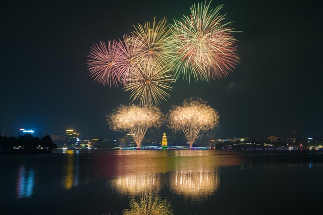 Những bông pháo hoa nhiều màu sắc liên tục được bắn lên cao, tạo nên khung cảnh huyền ảo bên hồ