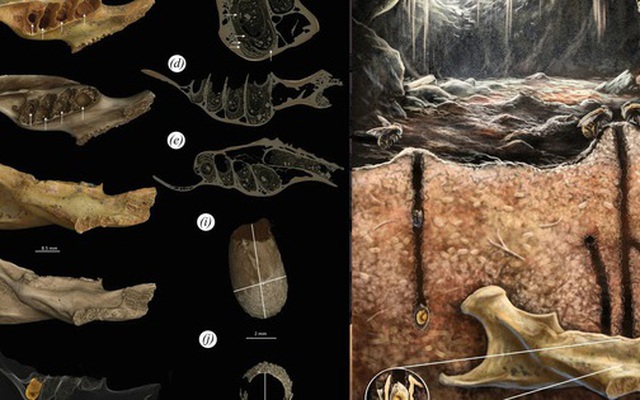 Hóa thạch hàm của loài gặm nhấm trong hang chứa hóa thạch tổ ong hiếm có và ảnh đồ họa cho thấy cách bầy ong đào hang - Ảnh: BẢO TÀNG LỊCH SỬ TỰ NHIÊN FLORIDA