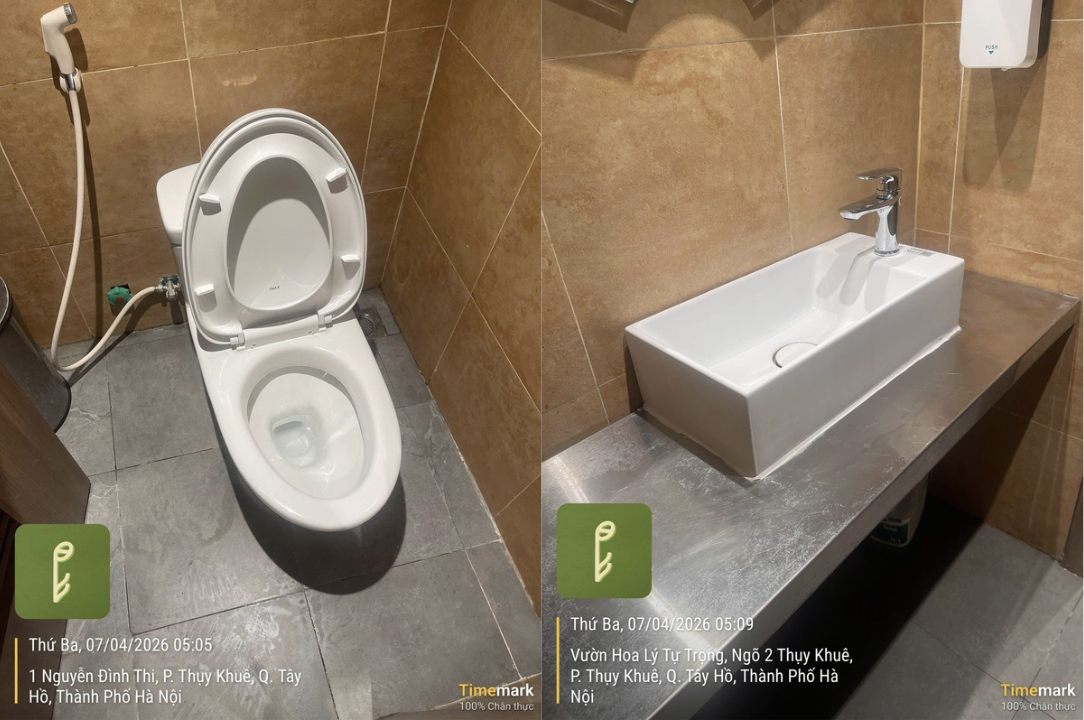 Tại chi nhánh Ngọc Hà, khu vực nhà vệ sinh đã dọn dẹp lại quạt thông gió, song sàn vẫn còn lưu lại nhiều vết chân, bồn rửa tay xuất hiện vết nước loang lổ. Khu vực sân bên ngoài ghi nhận một túi rác chưa được xử lý kịp thời dù thùng rác đặt ngay gần đó.
