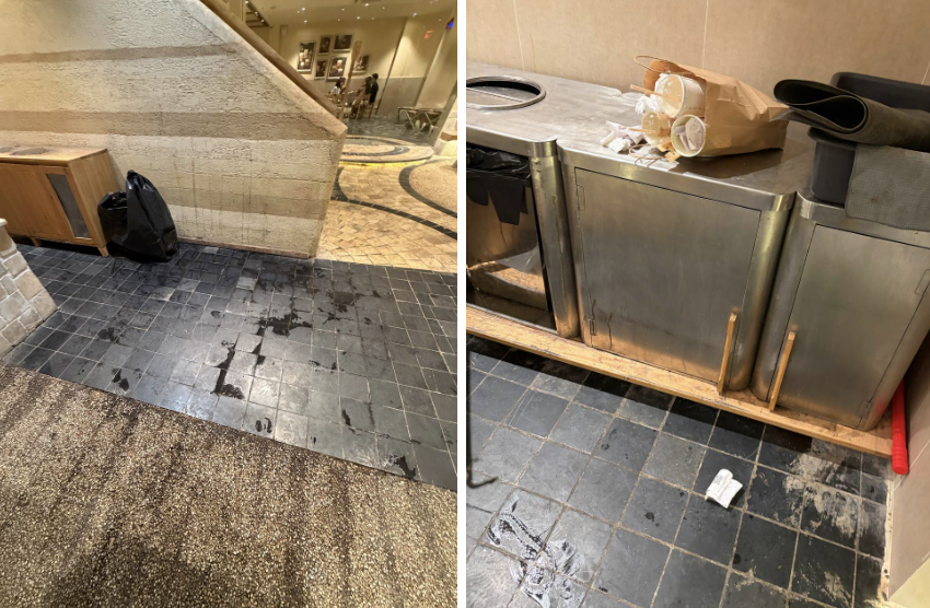 Tại khu vực nhà vệ sinh ở cả tầng 1 và tầng 2, sàn xuất hiện nhiều dấu chân do khách dẫm vào nước rồi di chuyển vào bên trong.