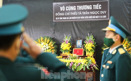 Đại diện và lãnh đạo các đơn vị lực lượng vũ trang quân đội, công an, tỉnh Yên Bái đến phúng viếng, chia sẻ mất mát với gia đình thiếu tá phi công Trần Ngọc Duy, sáng 1/2.