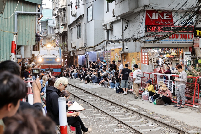 Khi tàu hỏa chạy qua, nhiều du khách ngồi dọc hai bên tuyến đường sắt, chỉ cách đoàn tàu chưa đầy 1m, tiềm ẩn nguy cơ mất an toàn.