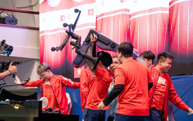 Khoảnh khắc nâng ghế ăn mừng đầy cảm xúc của Quốc Huy (Maris) sau khi mang về tấm Huy chương Vàng ở nội dung Liên Quân Mobile đồng đội nam