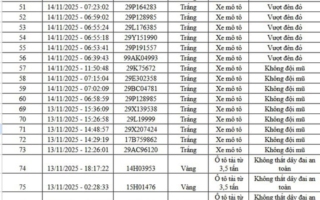 Mới đây, Cục Cảnh sát Giao thông đã công bố danh sách 83 trường hợp xe ô tô, xe máy vi phạm tại tuyến cao tốc Nội Bài - Lào Cai và nội đô Hà Nội, được phát hiện qua hệ thống camera AI. Danh sách được ghi nhận từ 12 giờ ngày 13/11 đến 12 giờ ngày 14/11.