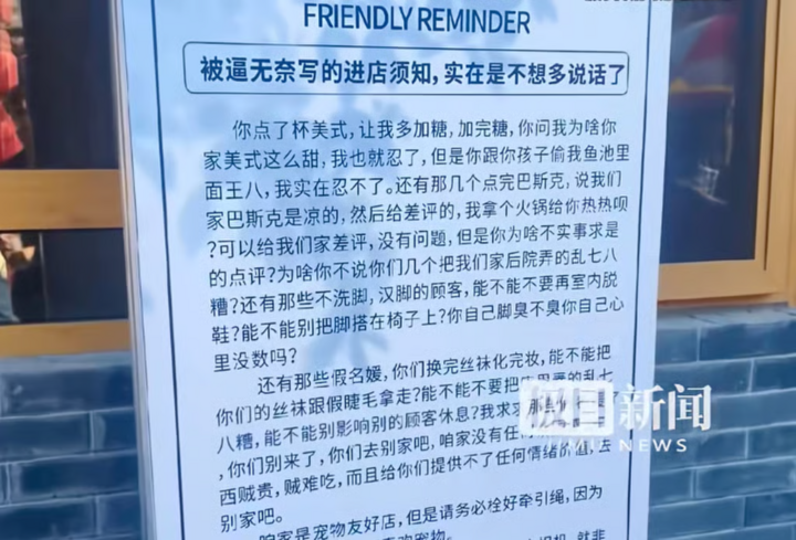 Mở đầu tấm biển là lời thú nhận đầy thẳng thắn: "Những dòng này được viết ra trong sự bất lực tột độ". Nội dung liệt kê danh sách dài những hành vi gây rối mà quán từng phải chịu đựng, từ hút thuốc trong nhà, đánh giá tiêu cực ác ý, đến việc thả rông thú cưng dù quán vốn rất thân thiện với động vật.