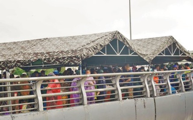 Người dân xếp hàng tại nút giao Ngọc Hội để khai báo thân nhân và nhận thực phẩm, lương thực miễn phí.