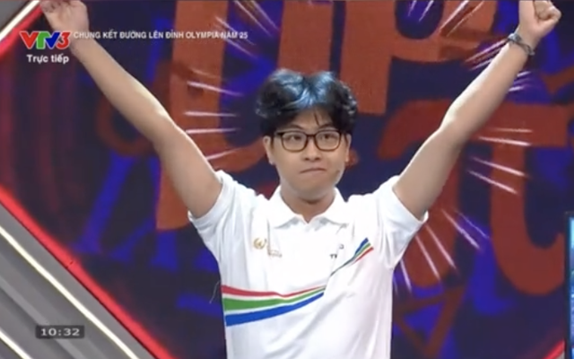 Dù chưa đưa ra câu trả lời, Bảo Khánh đã vui mừng ngay sau khi giành được quyền bấm chuông ở câu hỏi cuối (Ảnh chụp màn hình)