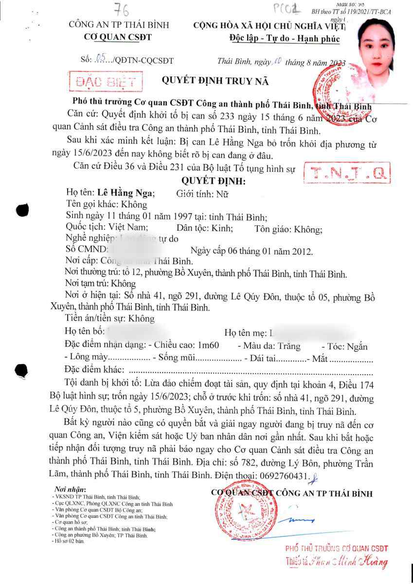 Cơ quan Cảnh sát điều tra Công an tỉnh Hưng Yên (Công an thành phố Thái Bình cũ) đã ra Quyết định truy nã số 05/QĐTN-CQCSĐT ngày 10/08/2023 đối với bị can Lê Hằng Nga, nghề nghiệp lao động tự do.