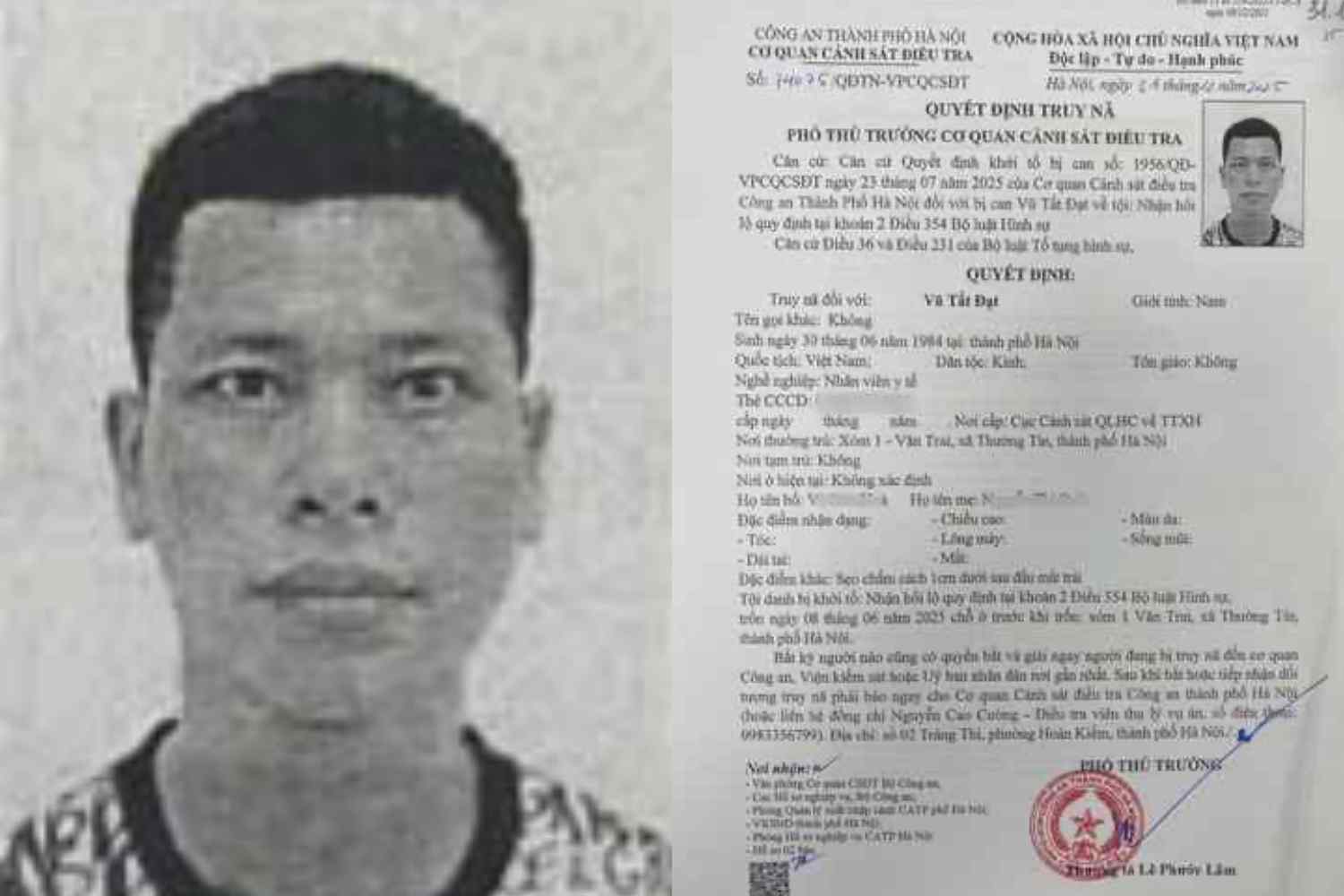 Theo quyết định, Vũ Tất Đạt có nghề nghiệp là nhân viên y tế có đặc điểm nhận dạng là sẹo chấm cách 1cm dưới sau đầu mắt trái. Ngày 23/7/2025, Cơ quan Cảnh sát điều tra Công an TP Hà Nội đã ra quyết định khởi tố bị can đối với Vũ Tất Đạt về tội Nhận hối lộ. Tuy nhiên, đối tượng đã bỏ trốn khỏi nơi cư trú. Ngày 31/12/2025, Cơ quan Cảnh sát điều tra Công an Thành phố đã ra quyết định truy nã đối tượng.