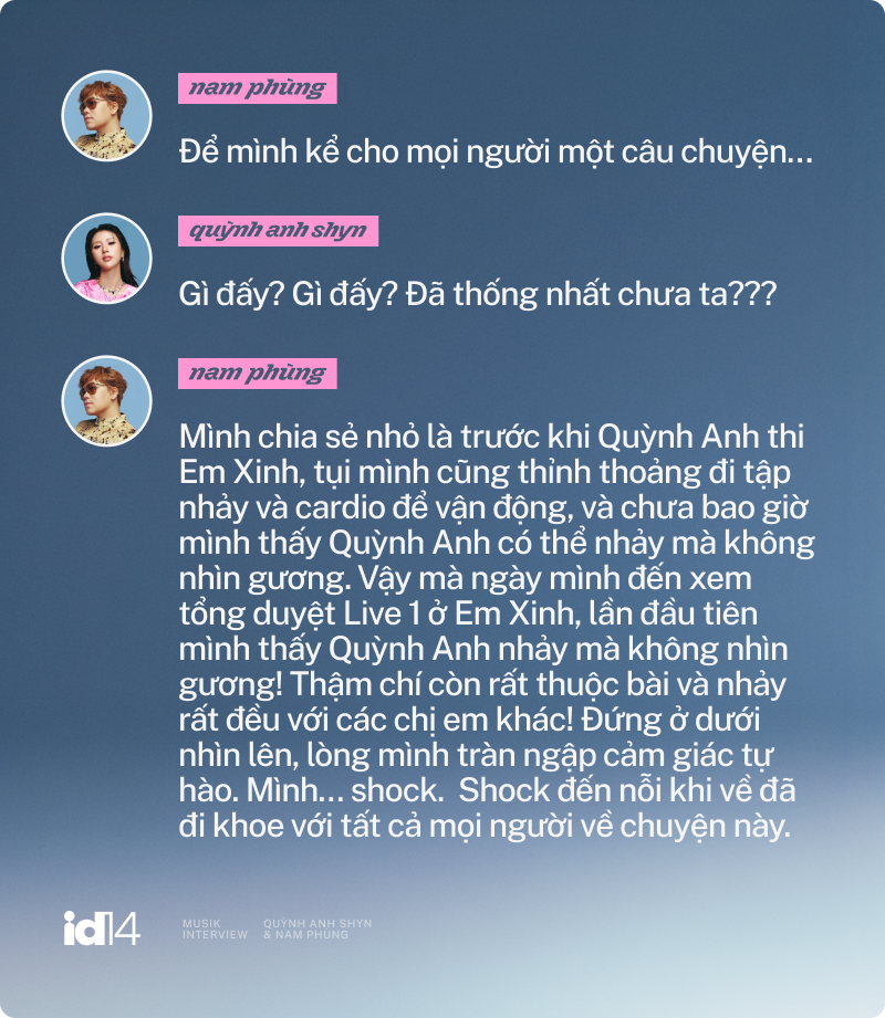 Nam Phùng: Mình chia sẻ nhỏ là trước khi Quỳnh Anh thi Em Xinh, tụi mình cũng thỉnh thoảng đi tập cardio để vận động, chưa bao giờ mình thấy Quỳnh Anh có thể nhảy mà không nhìn gương. Vậy mà ngày mình đến xem tổng duyệt Live 1 ở Em Xinh, lần đầu tiên mình thấy Quỳnh Anh nhảy mà không nhìn gương! Thậm chí còn rất thuộc bài và nhảy rất đều với các chị em khác! Đứng ở dưới nhìn lên, lòng mình tràn ngập cảm giác tự hào. Mình… shock. Shock đến nỗi khi về đã đi khoe với tất cả mọi người về chuyện này.