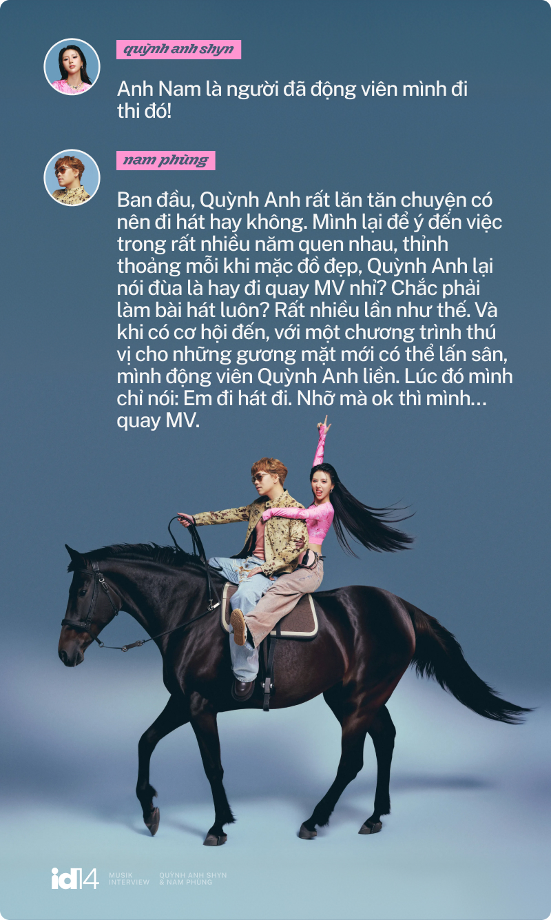 Quỳnh Anh Shyn: Mình phát hiện ra đây là cách mà bọn mình sáng tạo với nhau và cả hai đứa đều rất vui. Kể từ lúc mình thi Em Xinh đến bây giờ, mỗi lần mình đưa cho anh Nam một ý tưởng gì đấy, anh lại nghĩ thêm một thứ khác, rồi cả hai cứ thế đắp dần lên thành một moodboard hoàn chỉnh. Mỗi người một ý cho đến lúc gặp đạo diễn hay ekip bên ngoài lại được mọi người đưa thêm ý tưởng mới. Ai cũng có thể đóng góp vào sản phẩm cuối cùng. Tranh luận thì thỉnh thoảng cũng có chút xíu và không đáng kể.