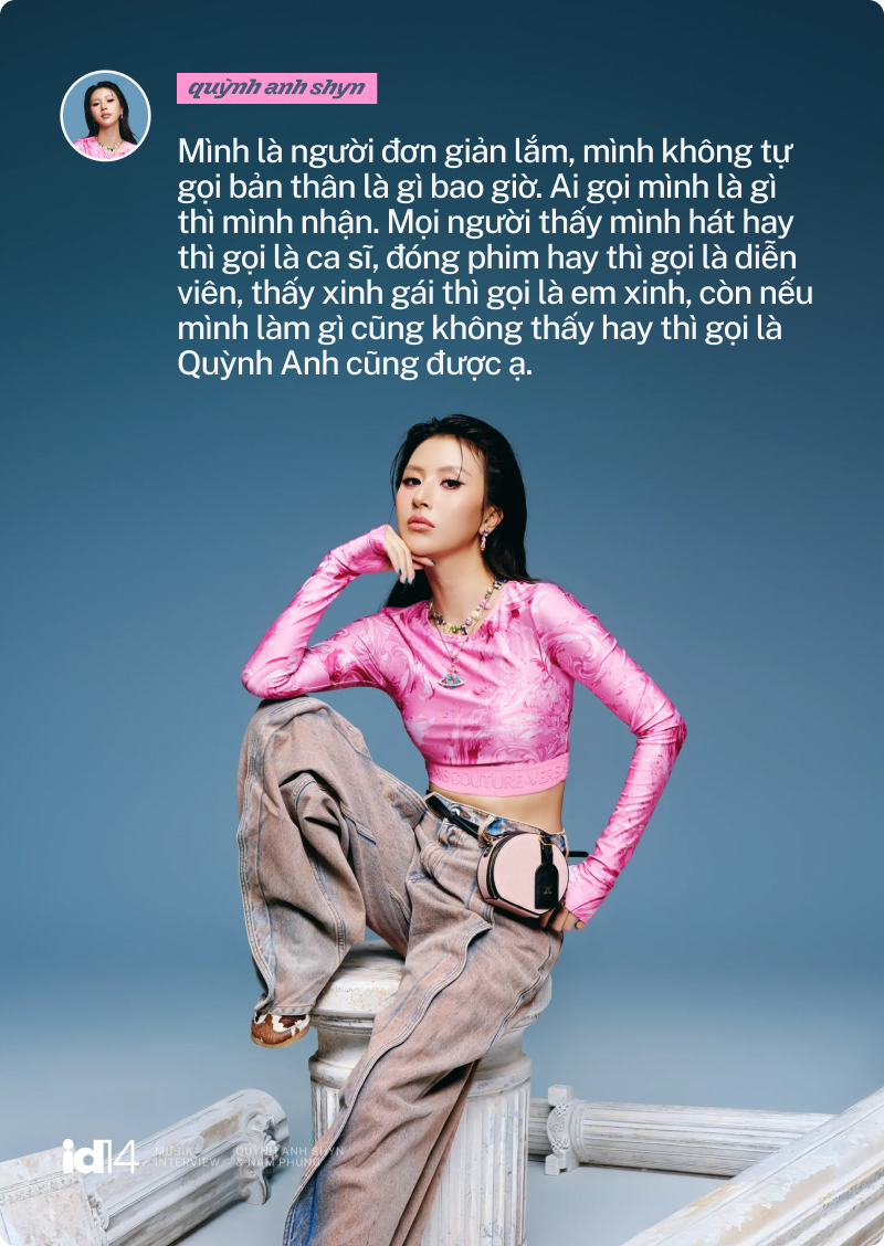 Quỳnh Anh Shyn: Mình là người đơn giản lắm, mình không tự gọi bản thân là gì bao giờ. Ai gọi mình là gì thì mình nhận. Mọi người thấy mình hát hay thì gọi là ca sĩ, đóng phim hay thì gọi là diễn viên, thấy xinh gái thì gọi là em xinh, còn nếu mình làm gì cũng không thấy hay thì gọi là Quỳnh Anh cũng được ạ.