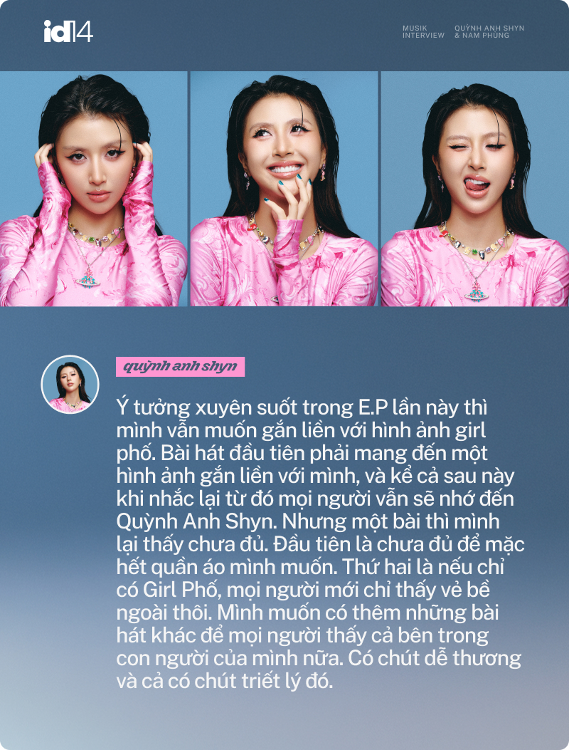 Ý tưởng xuyên suốt trong E.P lần này thì mình vẫn muốn gắn liền với hình ảnh girl phố. Bài hát đầu tiên phải mang đến một hình ảnh gắn liền với mình, và kể cả sau này khi nhắc lại từ đó mọi người vẫn sẽ nhớ đến Quỳnh Anh Shyn. Nhưng một bài thì mình lại thấy chưa đủ. Đầu tiên là chưa đủ để mặc hết quần áo mình muốn. Thứ hai là nếu chỉ có Girl Phố, mọi người mới chỉ thấy vẻ bề ngoài thôi. Mình muốn có thêm những bài hát khác để mọi người thấy cả bên trong con người của mình nữa. Có chút dễ thương và có cả chút triết lý đó.