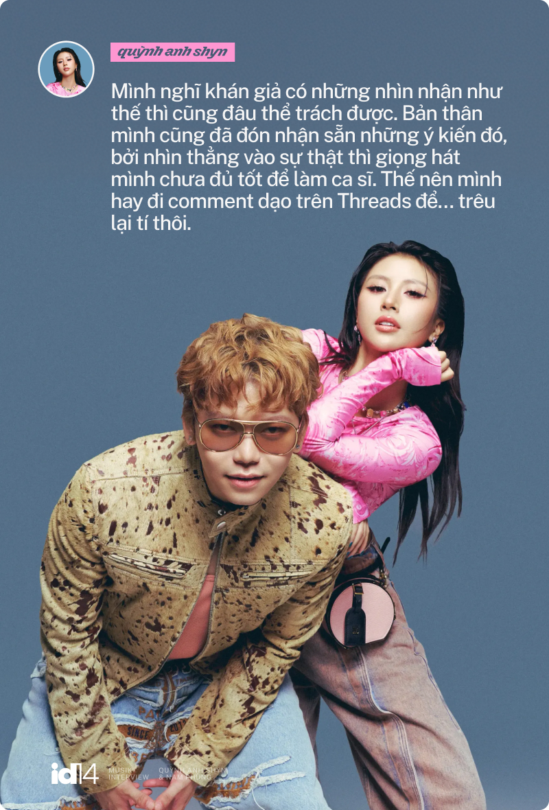 Quỳnh Anh Shyn: Mình nghĩ khán giả có những nhìn nhận như thế thì cũng đâu thể trách được. Bản thân mình cũng đã đón nhận sẵn những ý kiến đó, bởi nhìn thẳng vào sự thật thì giọng hát mình chưa đủ tốt để làm ca sĩ. Thế nên mình hay đi comment dạo trên Threads để… trêu lại tí thôi.