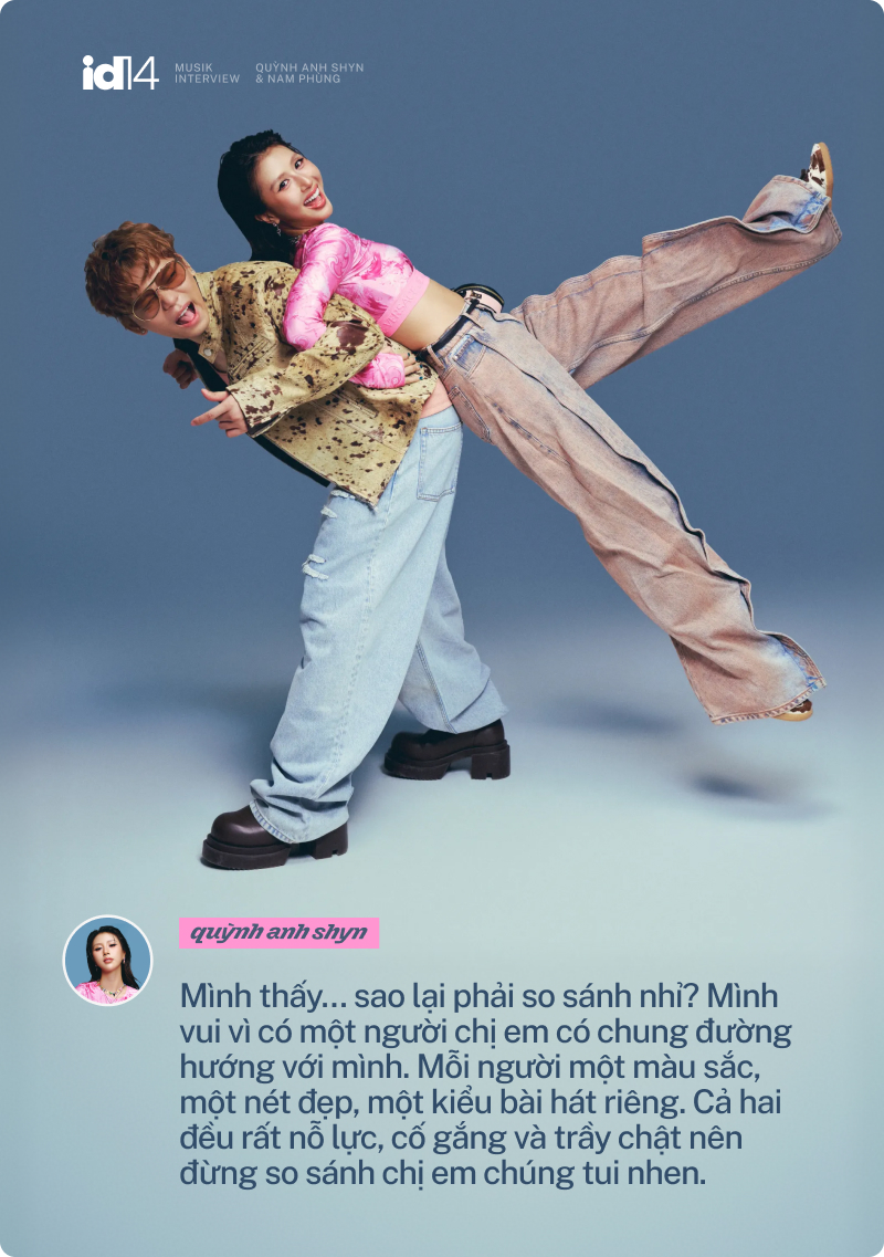 Quỳnh Anh Shyn: Mình thấy… sao lại phải so sánh nhỉ? Mình vui vì có một người chị em có chung đường hướng với mình. Mỗi người một màu sắc, một nét đẹp, một kiểu bài hát riêng. Cả hai đều rất nỗ lực, cố gắng và trầy chật nên đừng so sánh chị em chúng tui nhen.