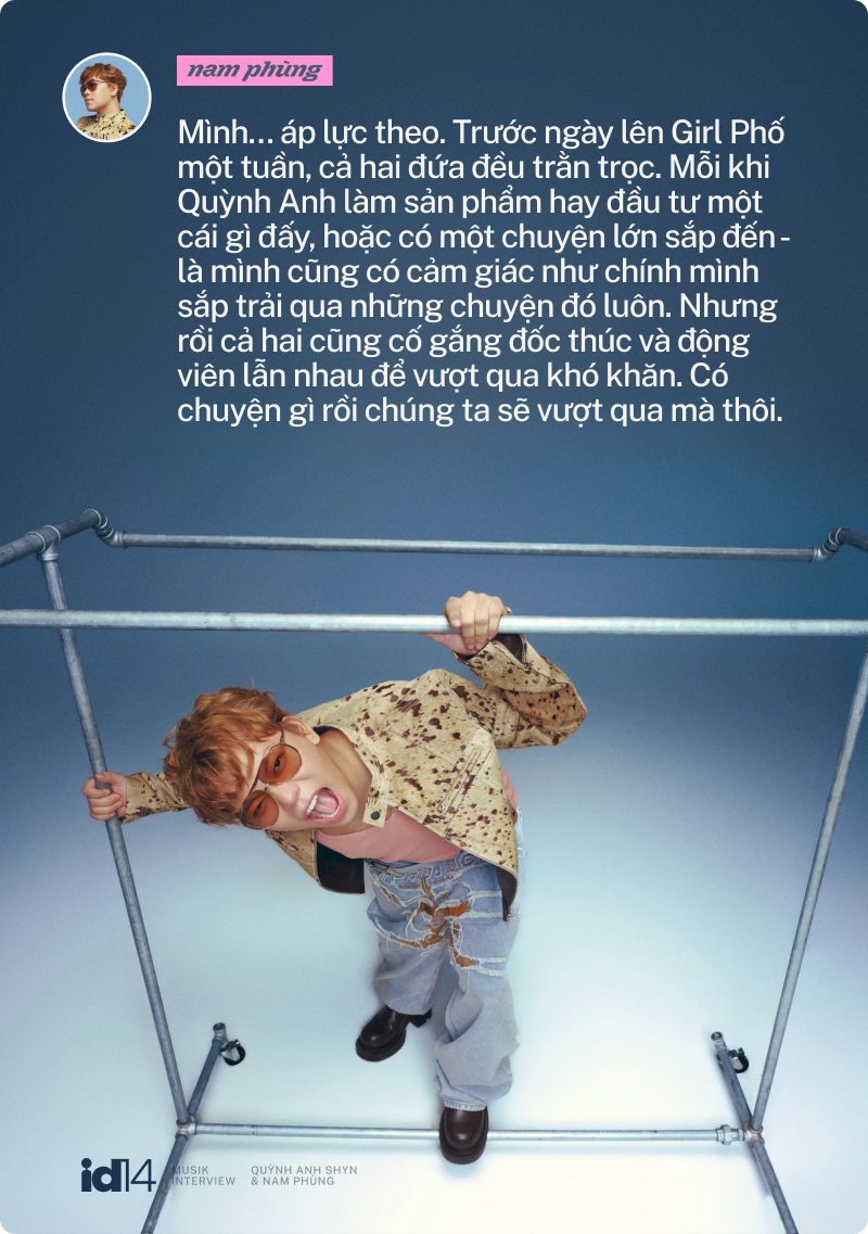 Nam Phùng: Mình… áp lực theo. Bình thường hai đứa ngủ rất ngon, nhưng đến trước ngày lên Girl Phố một tuần, cả hai đều trằn trọc. Lần nào cũng vậy, mỗi khi Quỳnh Anh làm sản phẩm hay đầu tư một cái gì đấy, hoặc có một việc quan trọng sắp diễn ra - mình đều có cảm giác như chính mình sắp trải qua những chuyện đó luôn. Nhưng rồi cả hai cũng cố gắng đốc thúc và động viên lẫn nhau để vượt qua khó khăn. Có chuyện gì rồi chúng ta sẽ vượt qua mà thôi.