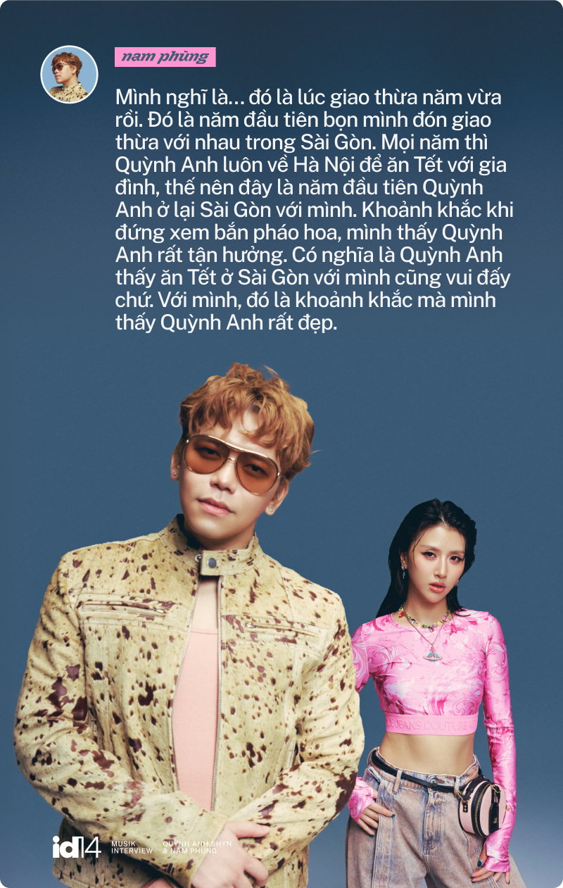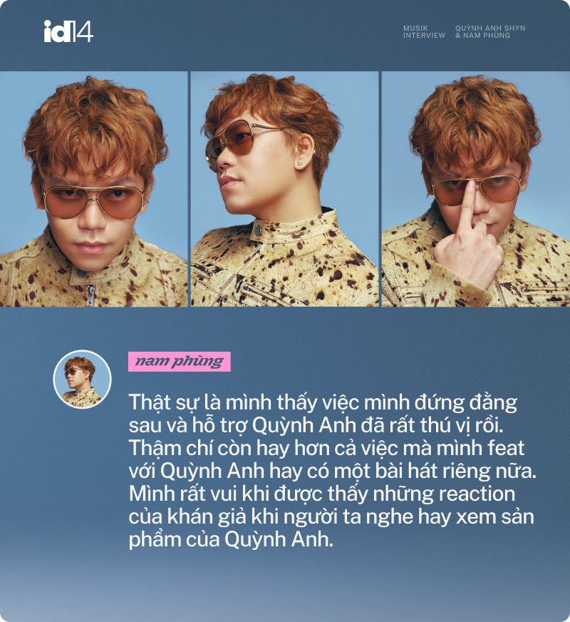 Nam Phùng: Thật sự là mình thấy việc mình đứng đằng sau và hỗ trợ Quỳnh Anh đã rất thú vị rồi. Thậm chí còn hay hơn cả việc mà mình feat với Quỳnh Anh hay có một bài hát riêng nữa. Mình rất vui khi được thấy những reaction của khán giả khi người ta nghe hay xem sản phẩm của Quỳnh Anh.