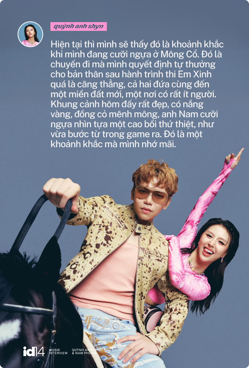 Quỳnh Anh Shyn: Hiện tại thì mình sẽ thấy đó là khoảnh khắc khi mình đang cưỡi ngựa ở Mông Cổ. Đó là chuyến đi mà mình quyết định tự thưởng cho bản thân sau hành trình thi Em Xinh quá là căng thẳng, cả hai đứa cùng đến một miền đất mới, một nơi có rất ít người. Khung cảnh hôm đấy rất đẹp, có nắng vàng, đồng cỏ mênh mông, anh Nam cưỡi ngựa nhìn tựa một cao bồi thứ thiệt, như vừa bước từ trong game ra. Đó là một khoảnh khắc mà mình nhớ mãi.