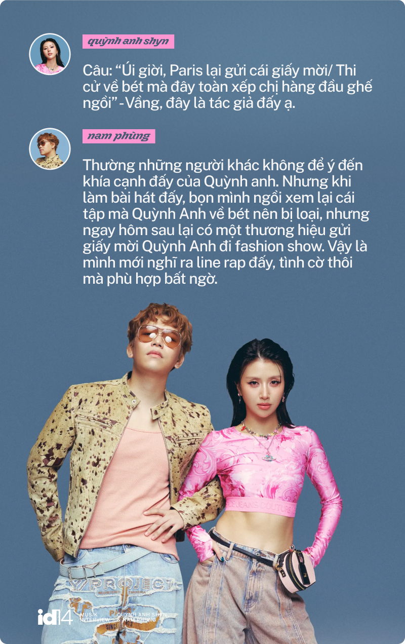 Nam Phùng: Thường những người khác không để ý đến khía cạnh đấy của Quỳnh Anh. Khi làm bài hát đấy, bọn mình ngồi xem lại cái tập mà Quỳnh Anh về bét nên bị loại, nhưng ngay hôm sau lại có một thương hiệu gửi giấy mời Quỳnh Anh đi fashion show. Vậy là mình mới nghĩ ra line rap đấy, tình cờ thôi mà phù hợp bất ngờ.