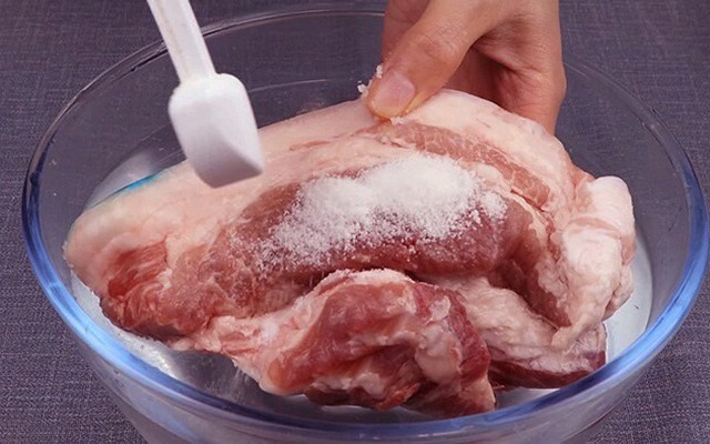 Một mẹo đơn giản để giữ được chất lượng thịt là rã đông bằng nước muối loãng. Với cách này, chỉ cần một thau nước lạnh, cho vào khoảng một thìa cà phê muối rồi khuấy tan. Sau đó thả miếng thịt lợn đông lạnh vào ngâm ngập hoàn toàn. Nhờ có muối, lớp bề mặt thịt sẽ mềm ra nhanh hơn, giúp dao dễ cắt mà không cần chờ thịt rã đông hoàn toàn.