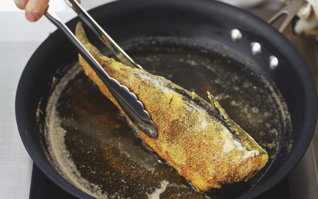 Ngoài ra, người nấu có thể cho một ít bột khô trực tiếp vào dầu nóng trước khi cho cá vào. Khi bột tan và phân tán trong dầu không chỉ giảm bắn dầu mà còn giúp dầu phân bố nhiệt đều, cho cá chín đẹp hơn.