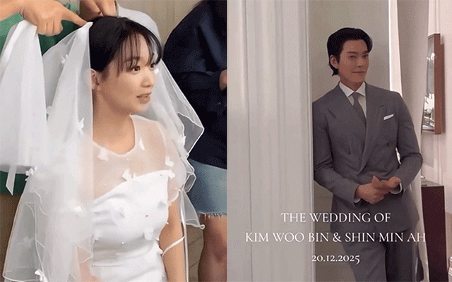 Bức ảnh cưới dưới trời tuyết "như xé sách bước ra" của cặp đôi đã làm mạng xã hội dậy sóng. Không những vậy, dân mạng còn phát sốt trước clip được cho là của cặp đôi lên đồ trước giờ G, chuẩn bị đến giây phút nói lời thề nguyện và chính thức trở thành vợ chồng. Trong clip này, cô dâu Shin Min Ah diện váy cưới trắng lộng lẫy, còn chú rể Kim Woo Bin "lên đồ" mặc suit xám cực kỳ lịch lãm. Đoạn clip trên nhanh chóng đã thu hút về lượng tương tác cực khủng.