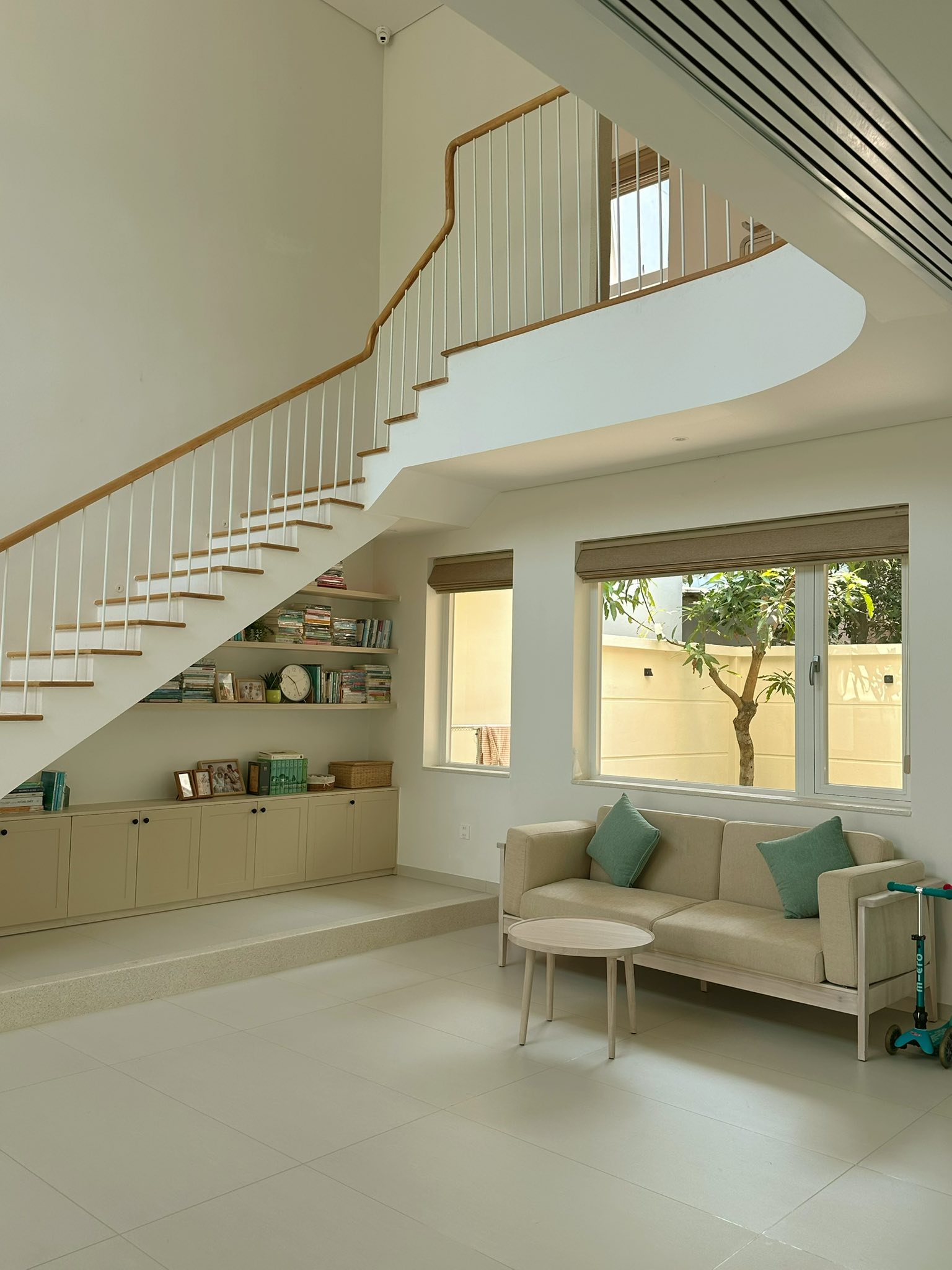 Không gian tầng trệt không chỉ là nơi sinh hoạt chung, mà gần như là trung tâm của toàn bộ đời sống gia đình. " Những ngày con không đi học, phần lớn thời gian cả nhà mình sẽ ở đây. Ba mẹ làm việc, các con chơi, hoặc cùng nhau làm những điều mình thích".