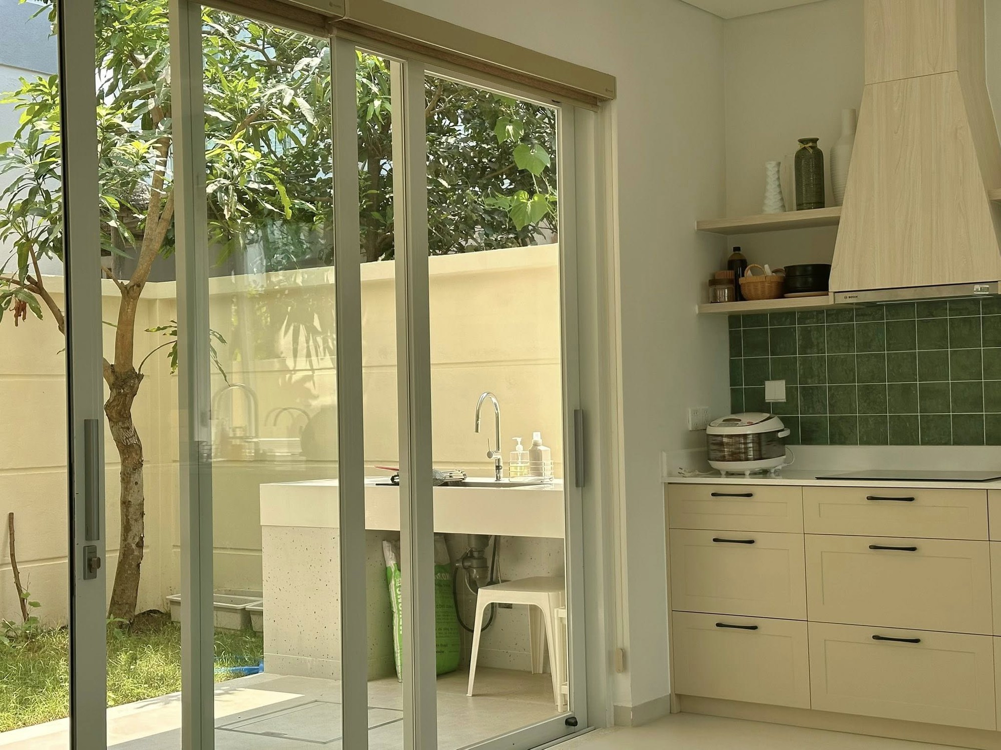 Căn bếp được thiết kế theo dạng chữ I, kết hợp với đảo bếp nhỏ. Nhờ hệ cửa kính bao quanh, không gian luôn tràn ngập ánh sáng tự nhiên. Bảo Nhi thậm chí còn mạnh dạn loại bỏ tủ bếp trên để tạo cảm giác thoáng đãng cho không gian bếp. "Bếp chữ I và đảo bếp là đủ dùng cho cả nhà, nên mình bỏ tủ trên để không gian nhẹ và xinh hơn".