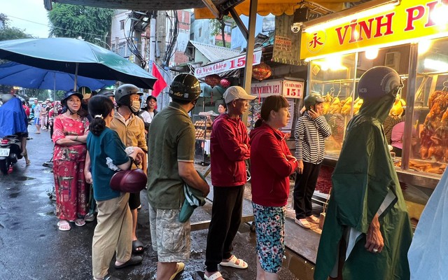 Kế đó, tiệm heo quay cũng tấp nập khách đứng xếp hàng chờ đợi. "Tranh thủ trời có mưa nhỏ nên tôi đến mua thịt quay về cúng sớm. Giá heo quay được niêm yết công khai nên mình yên tâm không lo bị chặt chém" - chị Mùi (ngụ phường Chợ Lớn) nói